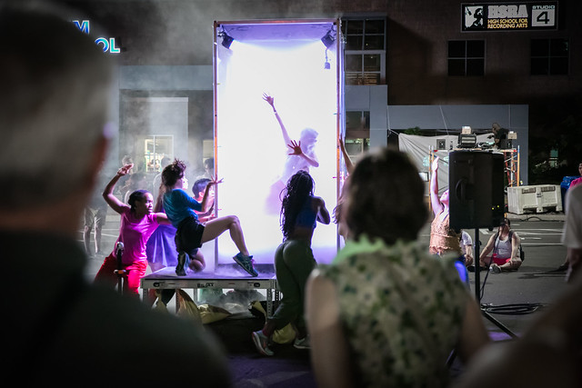 At 11 pm each festival night, lead artist and choreographer Rosy Simas (Seneca) directs performers in sculptural costumes, highlighted by projection, as they move through the crowd in a procession along Franklin Avenue. The hour-long moving performance ends at an installation curated by Heid E. Erdrich (Ojibwe) and Jonathan Thunder (Ojibwe). There, participants are invited to engage movement through shadow play and to join community art-making activities related to a willow hoop hung with cloth flags that represent the many Native Nations with ties to the neighborhood. For Simas, this Northern Spark performance is an iteration of her on-going project Weave, drawn from the interwoven and interdependent nature of our world.